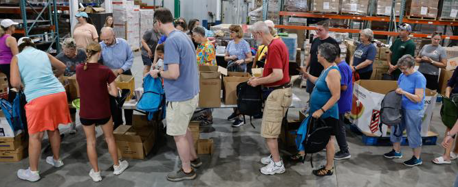 You and the other volunteers quickly and efficiently sorted and packed 1,600 backpacks of school supplies which will be distributed to area school kids aged Head Start-Senior High School!
